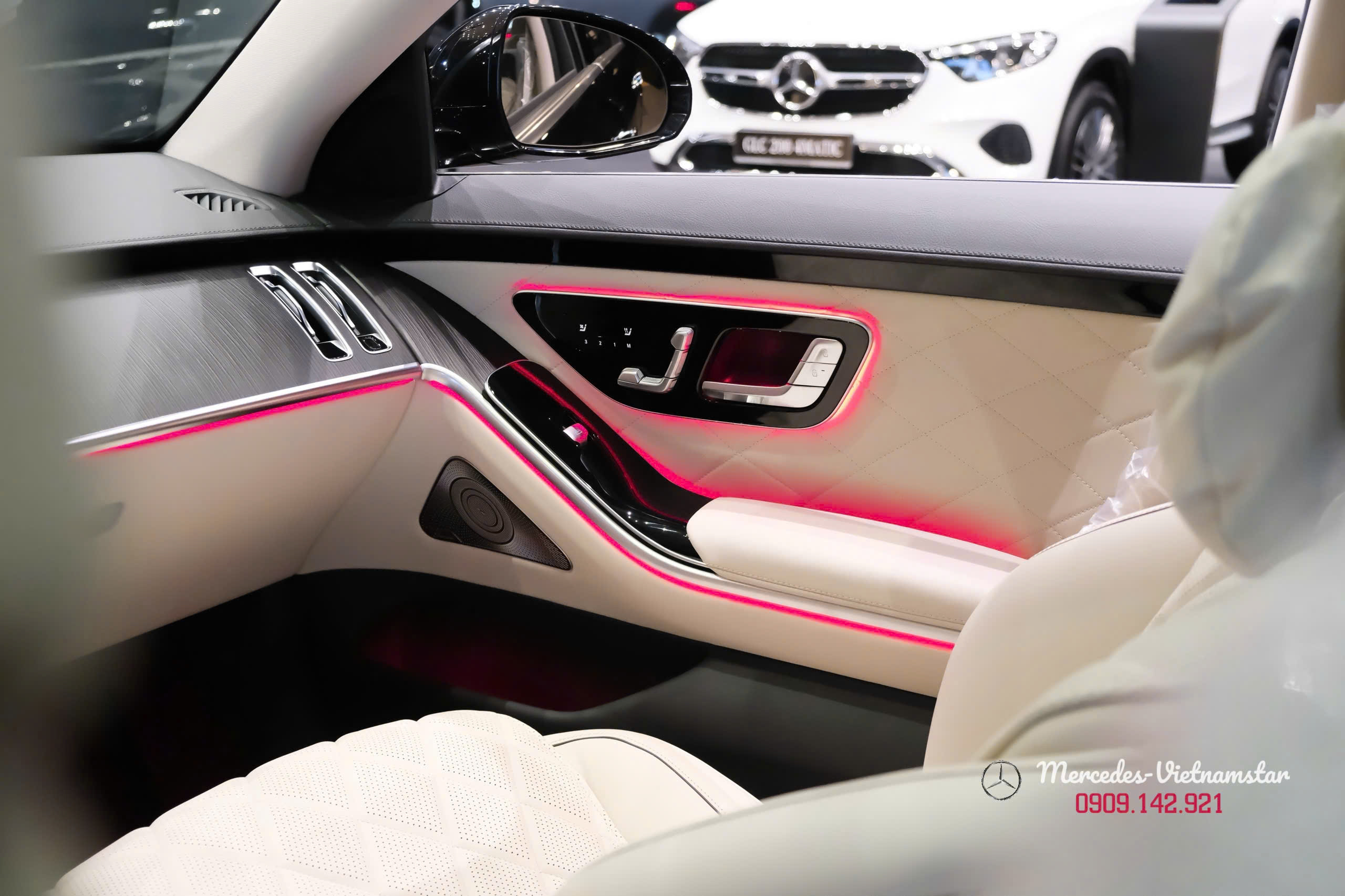 - Ốp bệ bước cửa với dòng chữ “Mercedes-Benz” phát sáng, tạo điểm nhấn sang trọng khi ra vào xe.